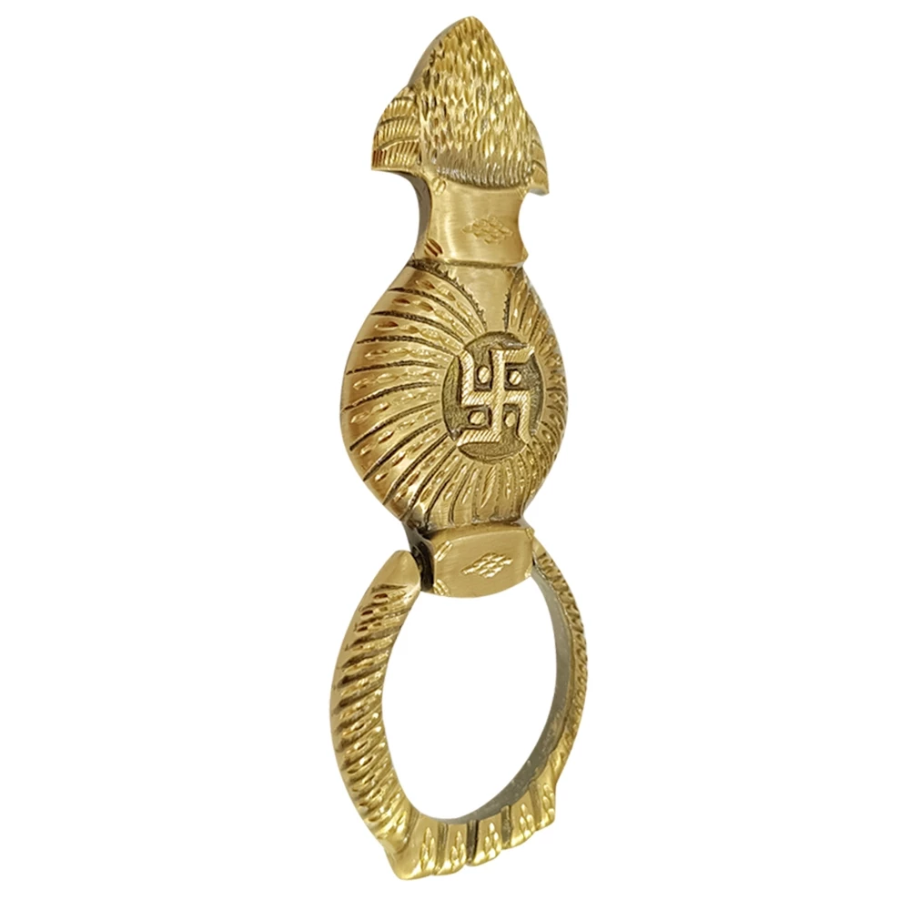 This Knocker is called brass kalash door knocker and Amrit kalash door knocker also. This door knocker made by pure brass metal. Diamond cutting workmanship is also included to enhance its beauty. In Indian mythological traditions, the "Amrit Kalash" is believed to be related to the churning of the ocean in which Lord Dhanvantari appeared with it in his hands. Some people may include additional religious and cultural motifs.
