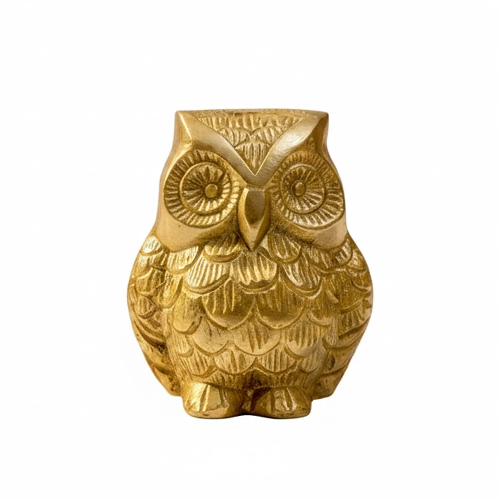 Bring wisdom, protection, and prosperity into your space with this finely detailed Big Brass Owl Showpiece. Crafted from solid brass and finished with a rich Brass Polished Lacquer, this owl figurine reflects traditional Indian craftsmanship and powerful symbolic meaning. In Vastu Shastra and Feng Shui, the owl is a symbol of intelligence, protection against negative energies, and financial stability. This intricately designed piece showcases sharp detailing in the feathers, eyes, and overall form—making it not just a spiritual token, but also an eye-catching home or office décor item. Standing at 5.75 cm in height and 6.5 cm wide, this brass owl fits well on desks, pooja shelves, or as part of a spiritual altar. Its lustrous lacquer finish enhances the brass’s natural glow while protecting it from tarnish, ensuring long-lasting brilliance.