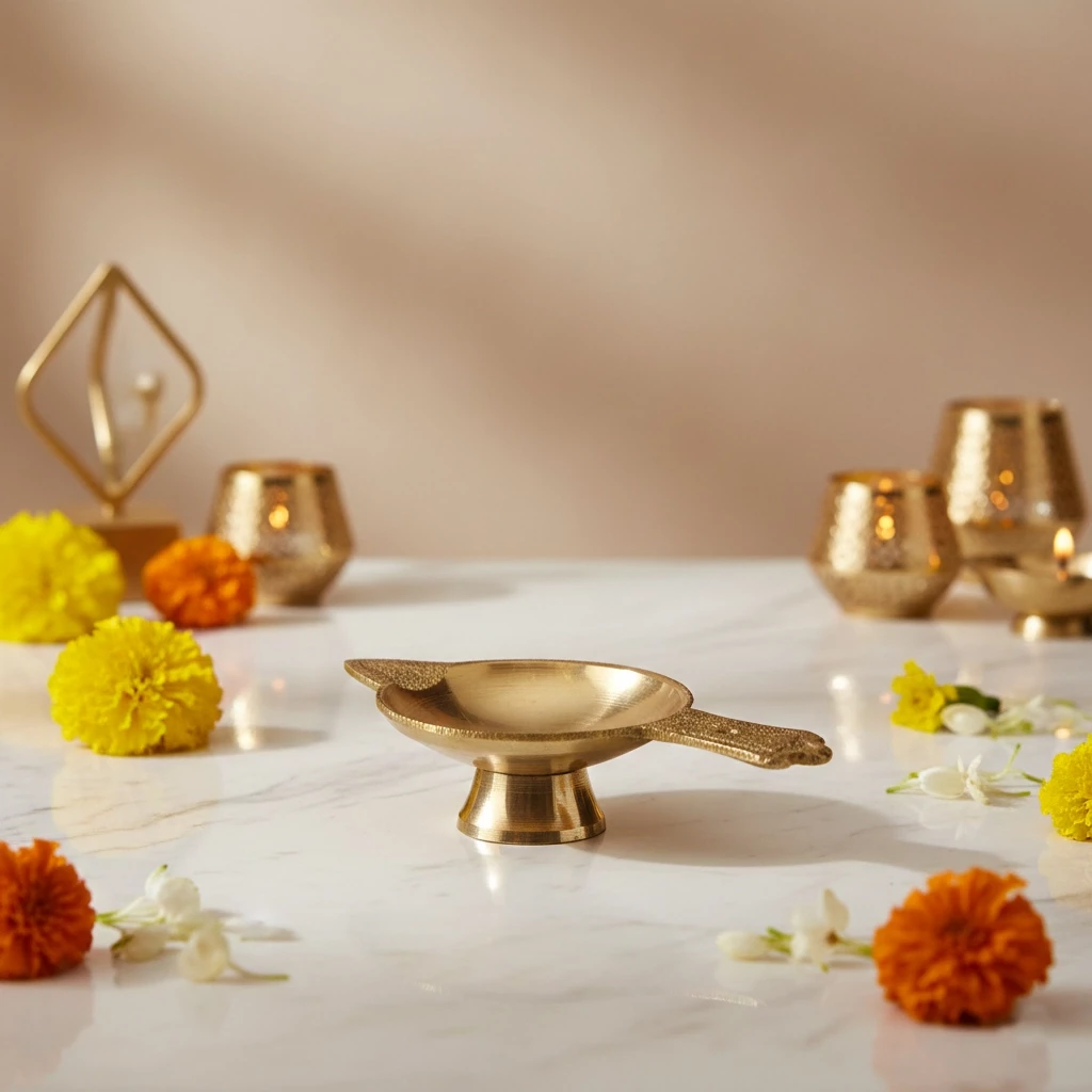 Light up your home temple or festive rituals with this beautiful set of Mini Brass Diyas (BDY-001). Designed with simplicity and tradition in mind, these small oil lamps are crafted from durable brass and polished for a warm golden finish. Each diya features a stable pedestal base and a short handle for easy use, making them perfect for daily pooja, aarti, or ceremonial lighting.