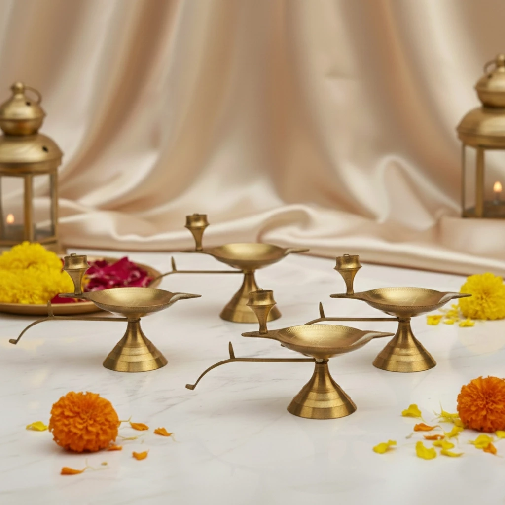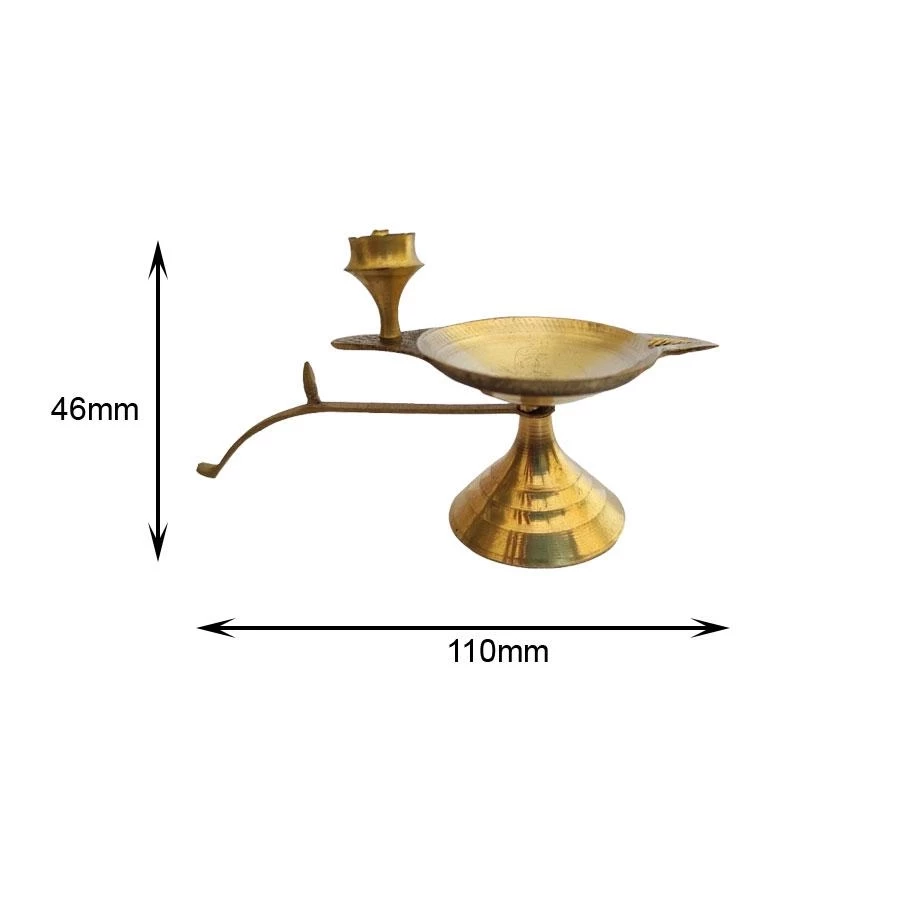 Illuminate your home with the warm glow of tradition with our exquisite Pure Brass Diya with Handle. Meticulously crafted from 100% pure brass, this traditional Indian oil lamp is more than just a decorative item; it's a symbol of light, hope, and spirituality. Measuring 110mm in length and 46mm in height, this brass diya is perfectly sized for your home temple, altar, or as a beautiful accent piece in your living room. The ergonomic handle ensures safe and convenient handling, making it ideal for daily puja rituals, Aarti, or carrying around during ceremonies. Our brass diya is designed not only for its aesthetic appeal but also for its longevity. The high-quality brass material is resistant to corrosion and tarnishing with proper care, promising years of radiant beauty. It's incredibly easy to maintain; simply clean with a brass cleaner or a mixture of lemon and baking soda to restore its original shine.