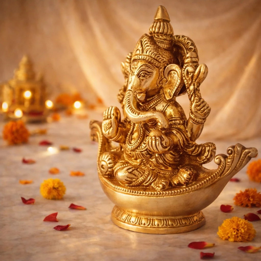 Invite the divine presence of Lord Ganesha into your home with this intricately crafted Brass Ganesh Ji Idol (BGL-03). Designed in a classic seated posture on a diya-like base, this statue symbolizes wisdom, prosperity, and new beginnings. The antique lacquered finish enhances the detailing and gives it a timeless appeal.