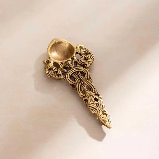 Elevate your spiritual rituals with the Twin Peacock Design Round Brass Pooja Aarti Spoon, a timeless piece handcrafted to perfection.This eye-catching aarti spoon has beautiful carvings that add to its overall charm. Golden in color, this Pooja spoon is made of brass with two beautiful peacocks supporting the Diya and depicting ethnic Indian design. It has a long handle that offers easy handling.Ideal for daily puja (aarti), hawan, and other sacred ceremonies, this brass spoon is specifically designed for pouring ghee into the Hawan Kund. Its round, ergonomic handle ensures a comfortable grip during rituals, while the sturdy, heat-resistant brass body maintains its shape and integrity through multiple uses.Whether you're setting up a new mandir at home, looking for high-quality pooja essentials, or gifting something meaningful for Diwali, Navratri, or a housewarming ceremony—this traditional brass spoon is the perfect choice.