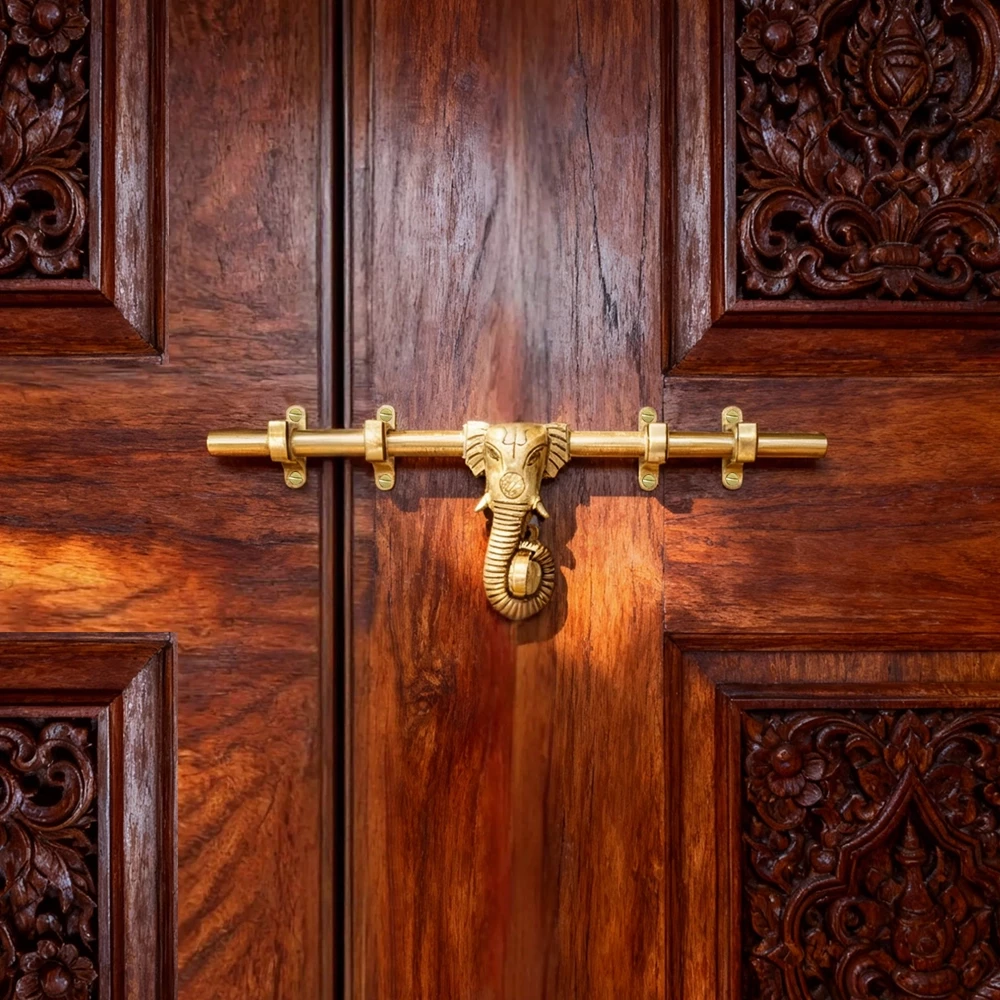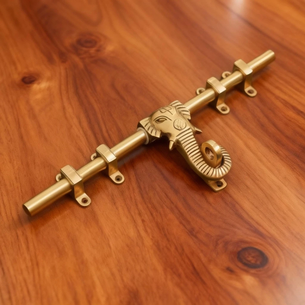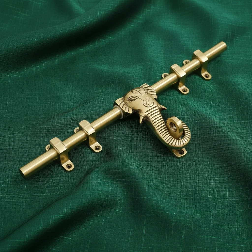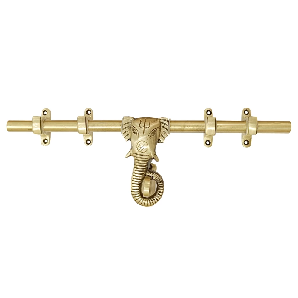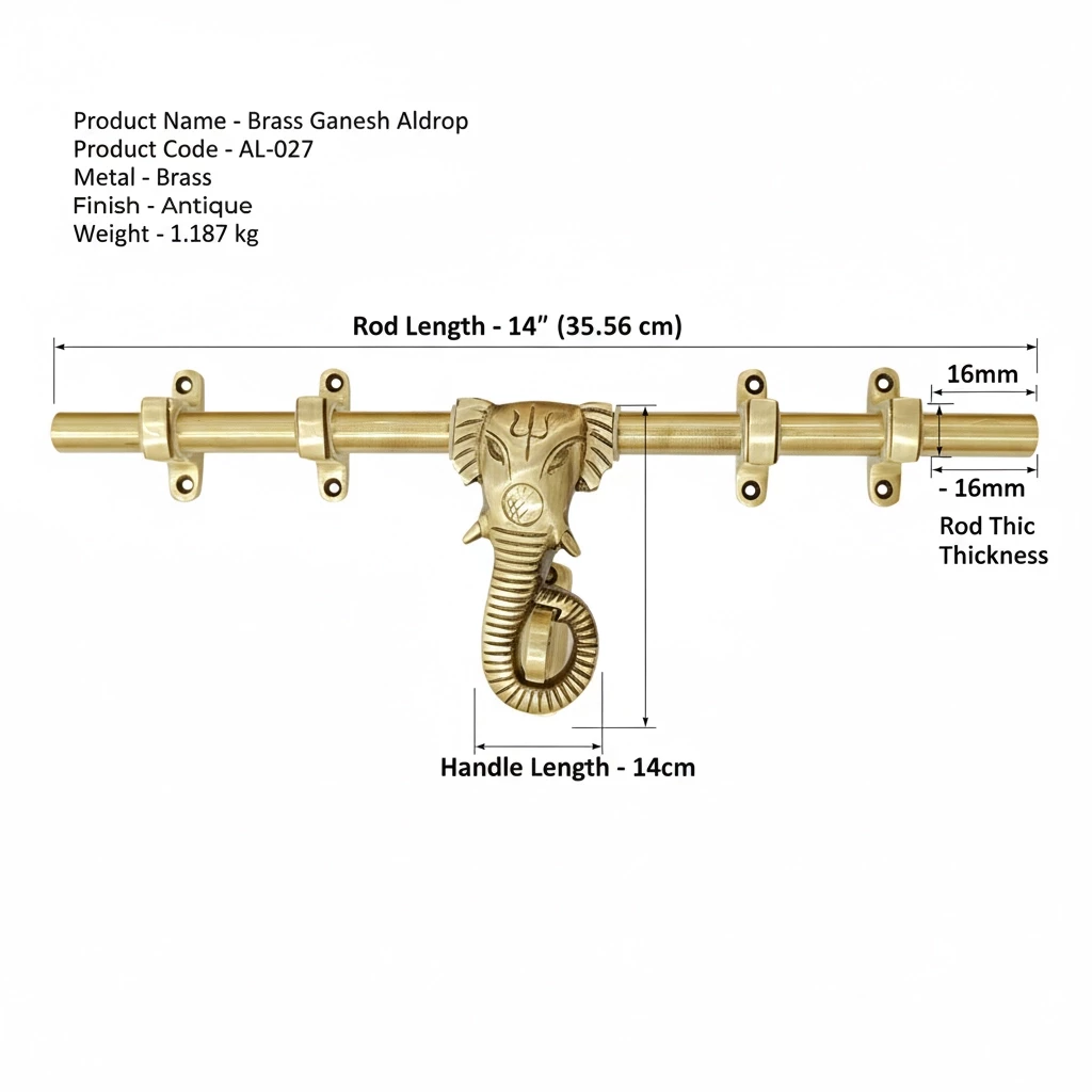 This elegant aldrop, crafted from durable brass with an antique finish, features a beautifully detailed Ganesh design. The rod has a thickness of 16mm and a length of 14 inches. The handle measures 14cm in length, and the total weight is 1.187gm. This piece combines traditional aesthetics with robust functionality, making it a perfect addition to any double door.