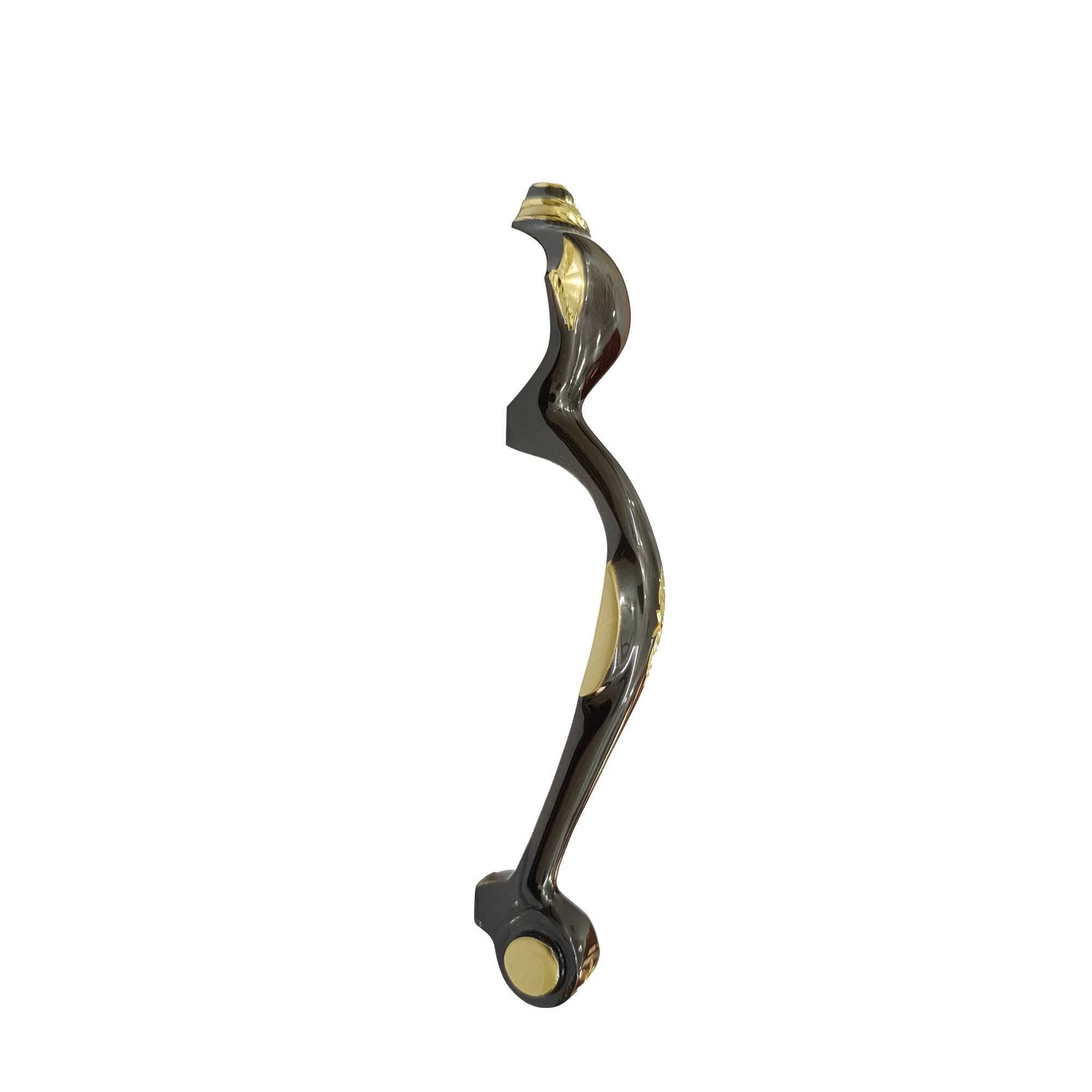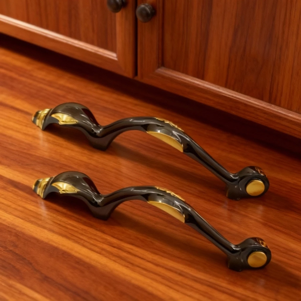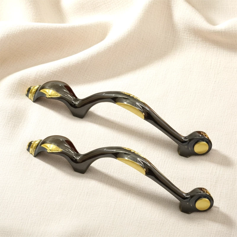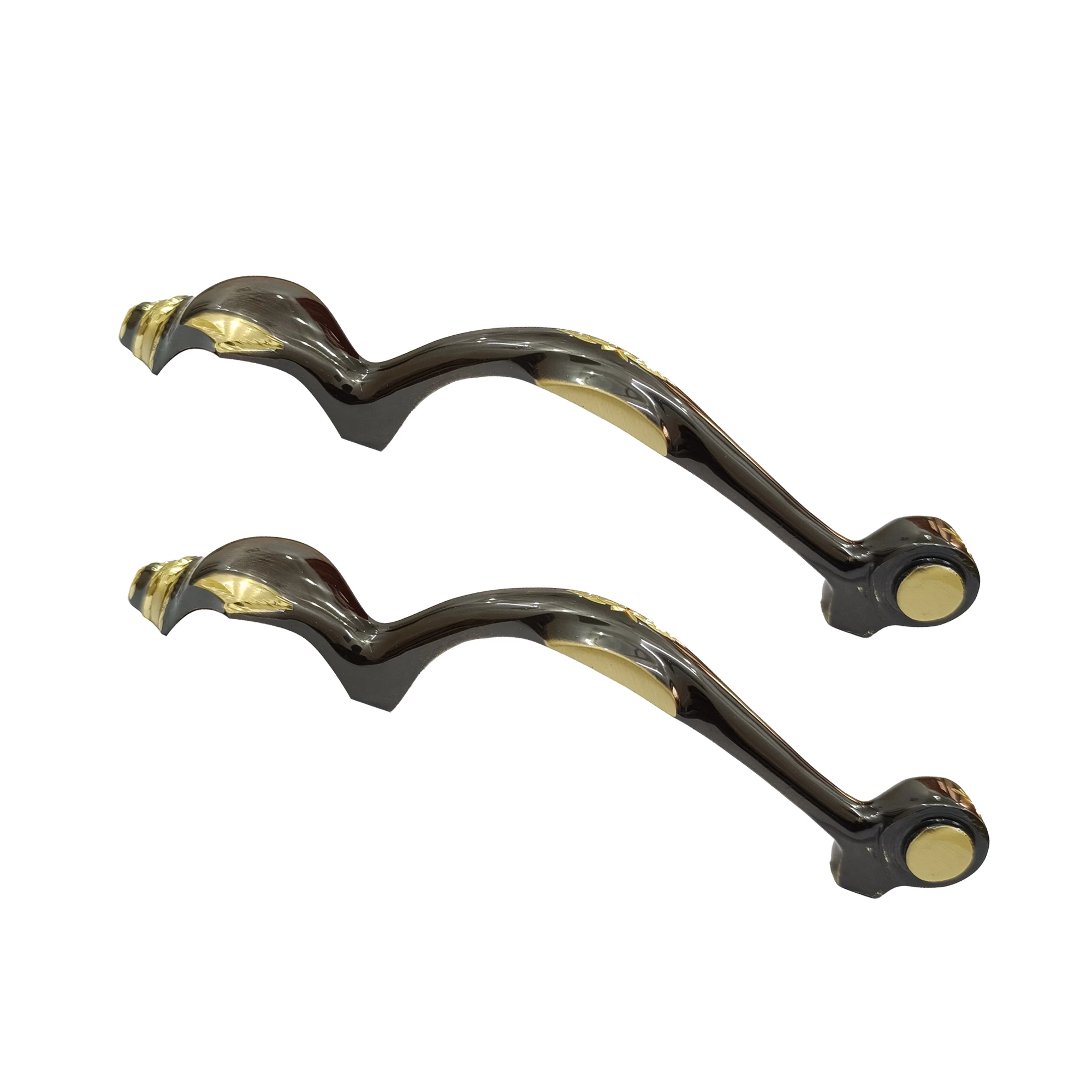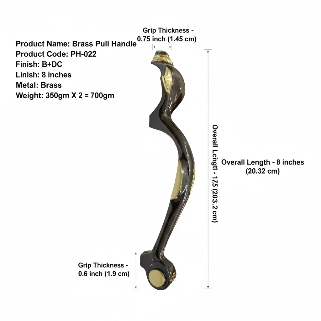 This is a stylish and modern brass pull handle designed for doors, cabinets, or other furniture. The handle has a unique, curved shape, reminiscent of a flowing 'S' curve, which gives it a dynamic and elegant appearance. The finish is a striking combination of a glossy black and a contrasting dual-color brass. The black portion covers the main body of the handle, providing a sophisticated look, while the dual-color brass accents are strategically placed at the top, bottom, and a central circular inlay. This combination of finishes highlights the handle's sculptural form and adds a touch of luxury. The handle is made from solid brass, ensuring durability and a substantial feel. It is sold in a set of two, with a combined weight of 700g.