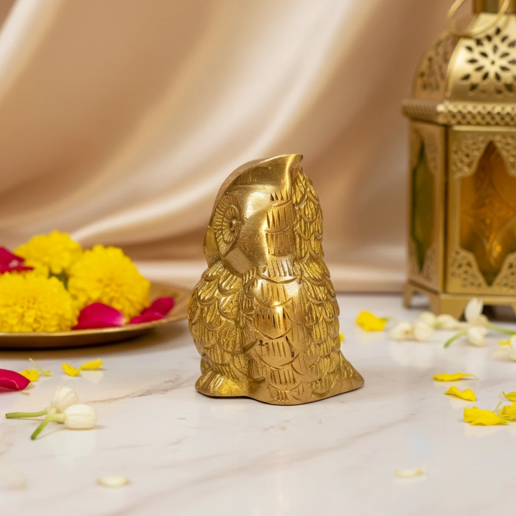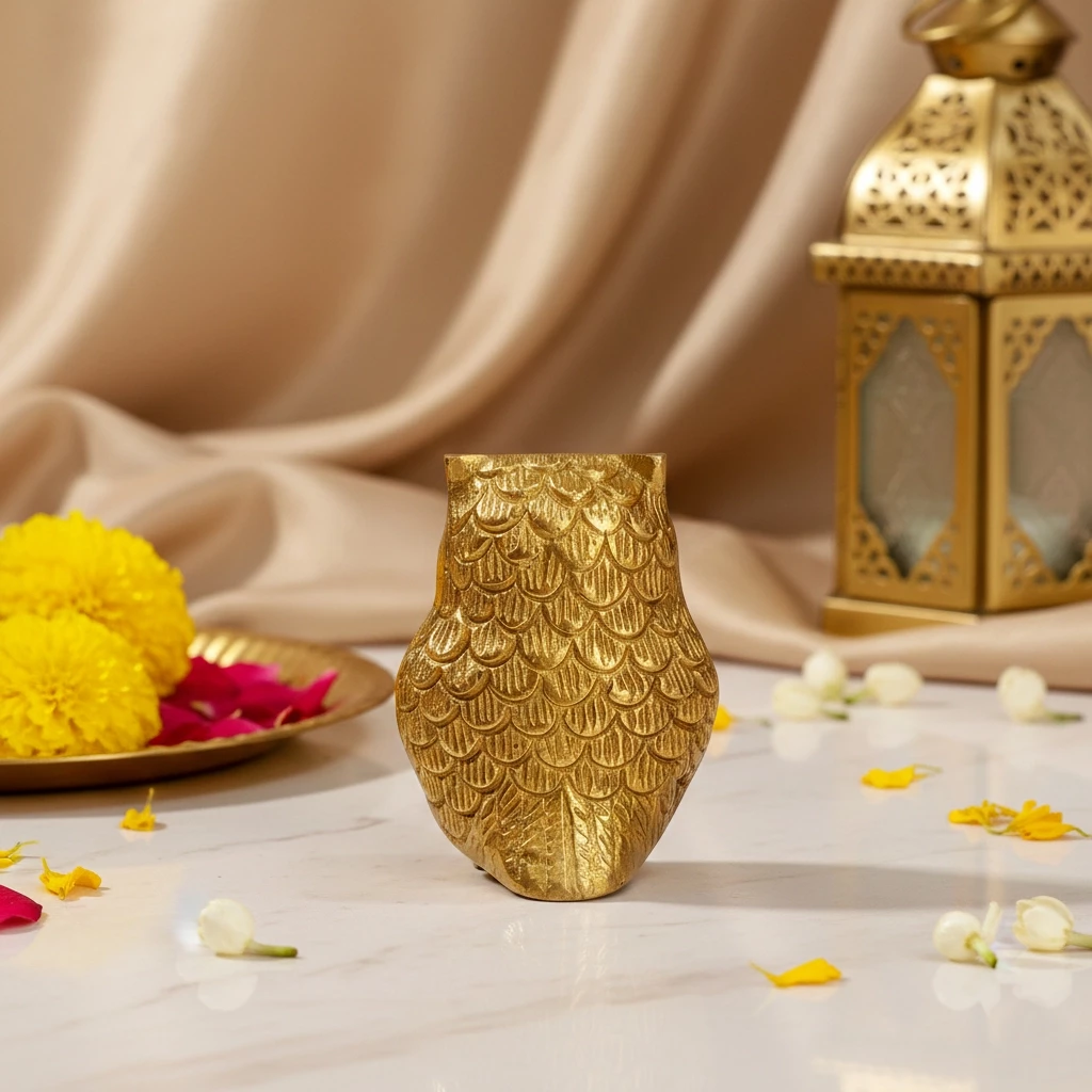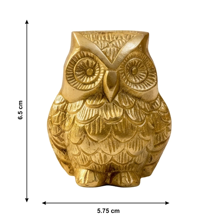 Bring wisdom, protection, and prosperity into your space with this finely detailed Big Brass Owl Showpiece. Crafted from solid brass and finished with a rich Brass Polished Lacquer, this owl figurine reflects traditional Indian craftsmanship and powerful symbolic meaning. In Vastu Shastra and Feng Shui, the owl is a symbol of intelligence, protection against negative energies, and financial stability. This intricately designed piece showcases sharp detailing in the feathers, eyes, and overall form—making it not just a spiritual token, but also an eye-catching home or office décor item. Standing at 5.75 cm in height and 6.5 cm wide, this brass owl fits well on desks, pooja shelves, or as part of a spiritual altar. Its lustrous lacquer finish enhances the brass’s natural glow while protecting it from tarnish, ensuring long-lasting brilliance.