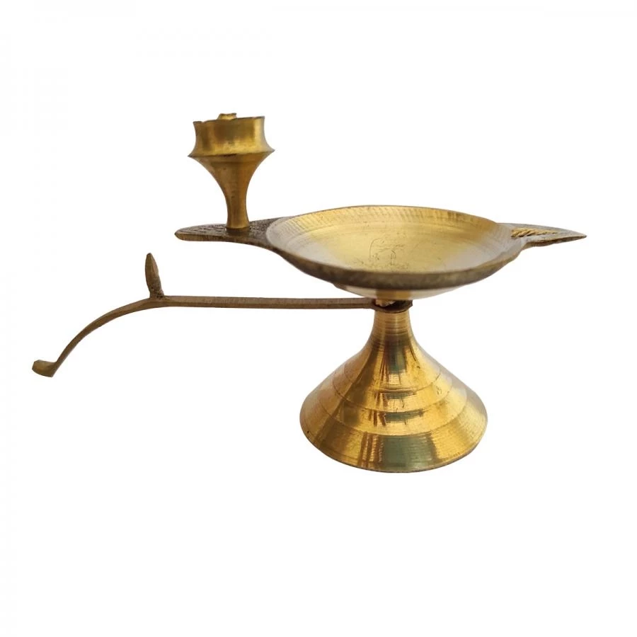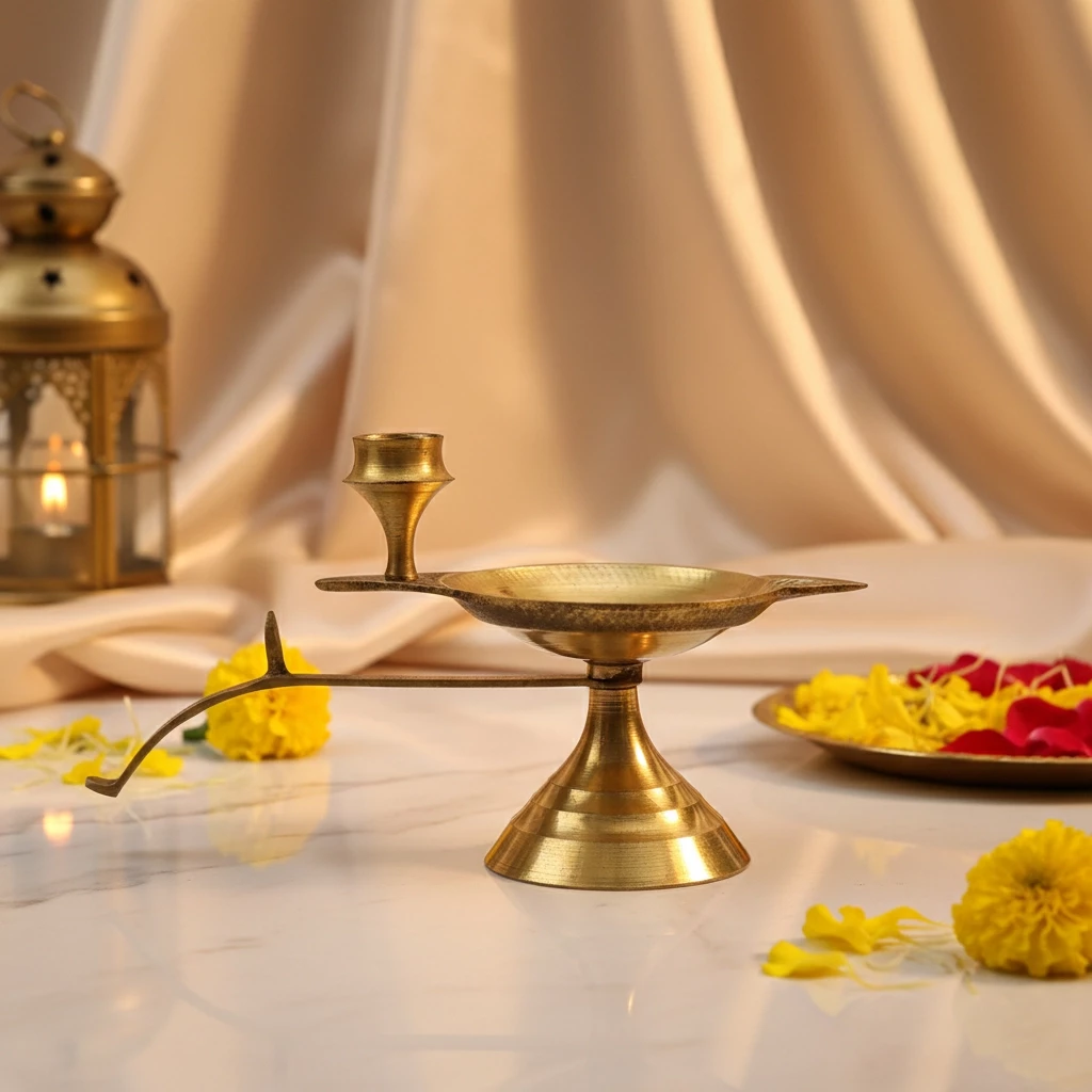 Illuminate your home with the warm glow of tradition with our exquisite Pure Brass Diya with Handle. Meticulously crafted from 100% pure brass, this traditional Indian oil lamp is more than just a decorative item; it's a symbol of light, hope, and spirituality. Measuring 110mm in length and 46mm in height, this brass diya is perfectly sized for your home temple, altar, or as a beautiful accent piece in your living room. The ergonomic handle ensures safe and convenient handling, making it ideal for daily puja rituals, Aarti, or carrying around during ceremonies. Our brass diya is designed not only for its aesthetic appeal but also for its longevity. The high-quality brass material is resistant to corrosion and tarnishing with proper care, promising years of radiant beauty. It's incredibly easy to maintain; simply clean with a brass cleaner or a mixture of lemon and baking soda to restore its original shine.