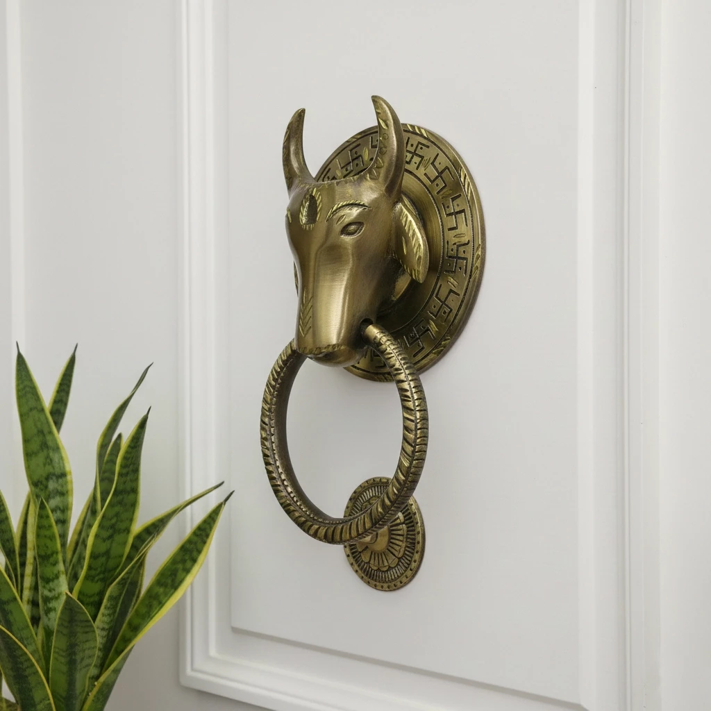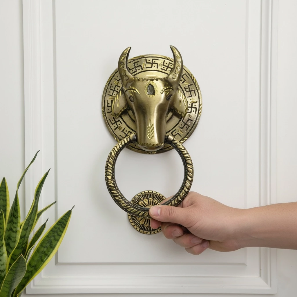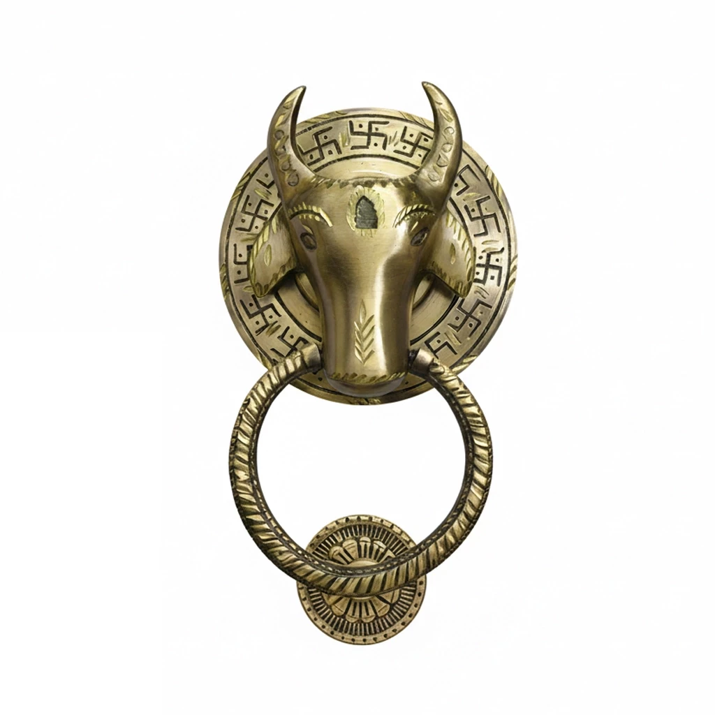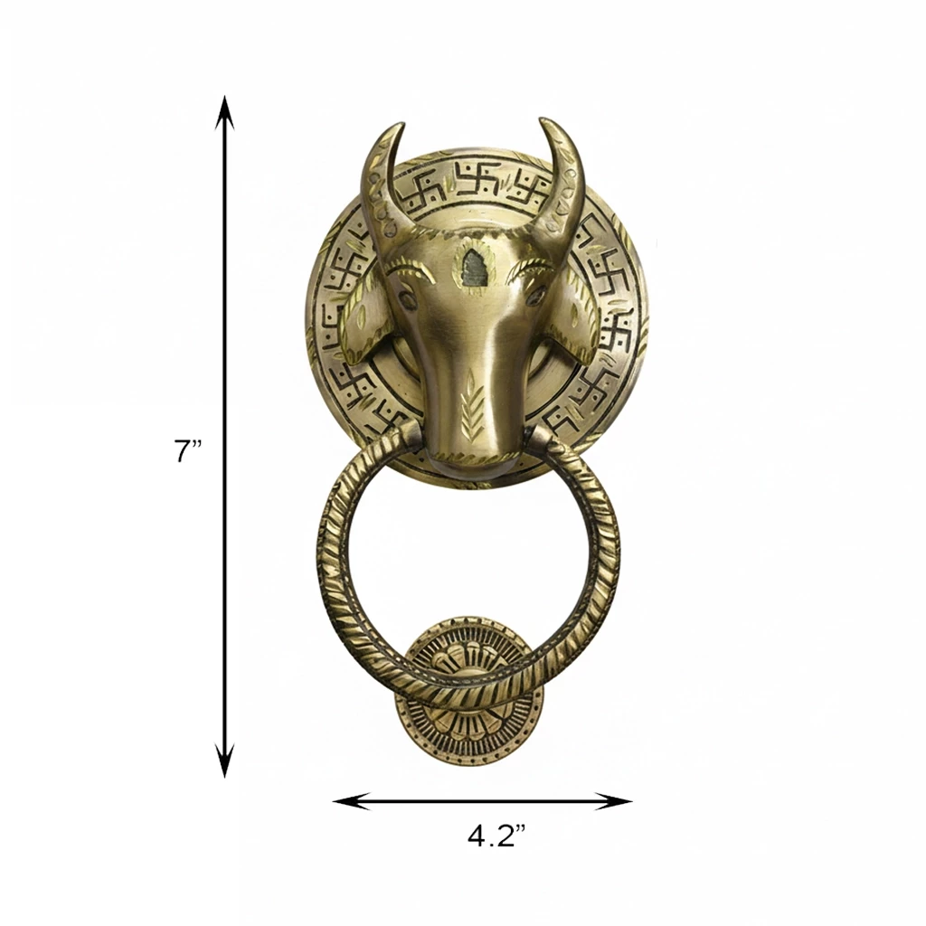 This is a door knocker made of high quality Brass which we know as Brass Nandi Door Knocker. To enhance its beauty, its has been inlayed by diamond cutting. This door knocker when installed on our door brings the divine power of the gods in our house and it also inspires the guests visiting our house with devotion. it also enhances the beauty of our home.